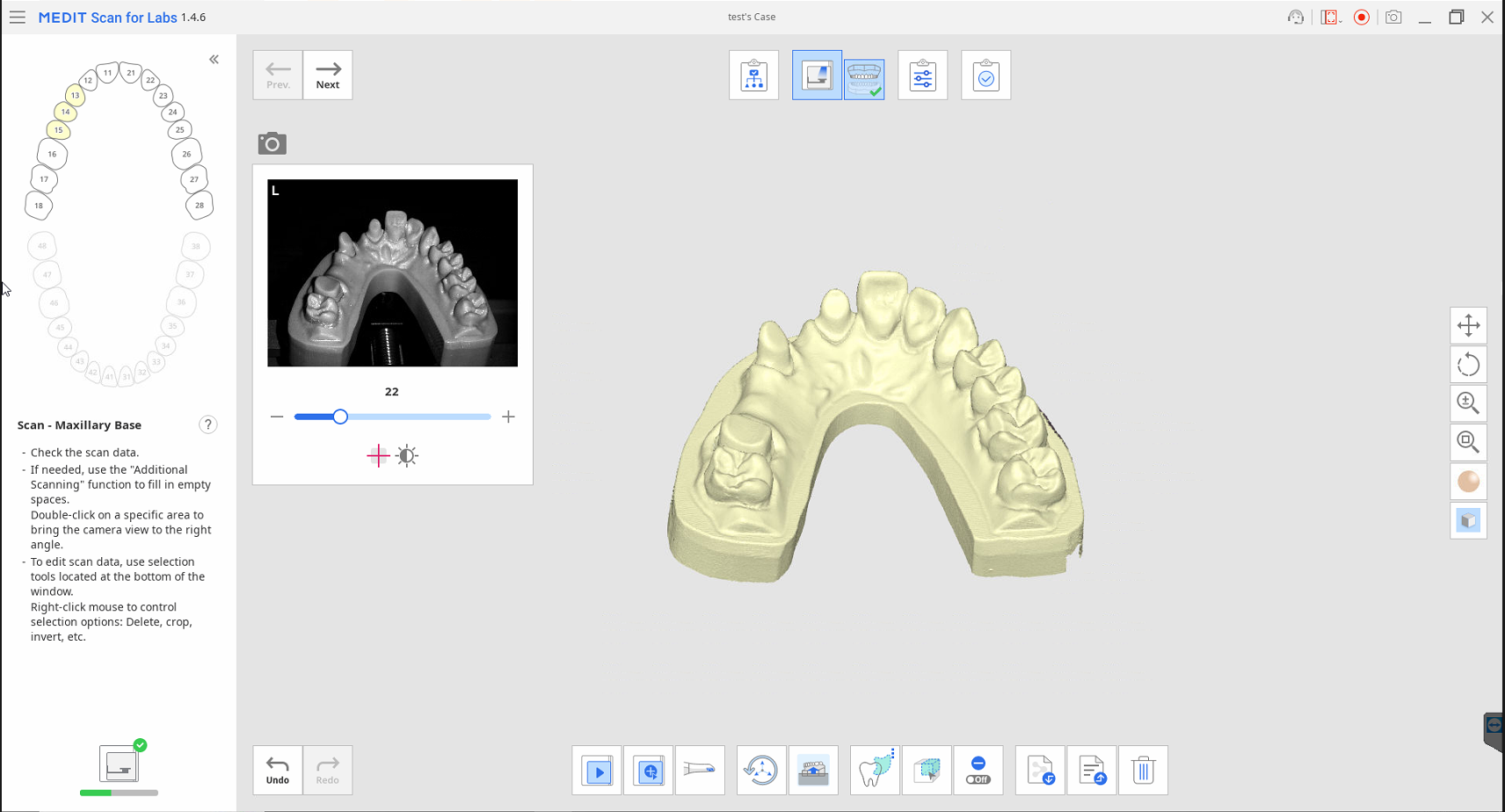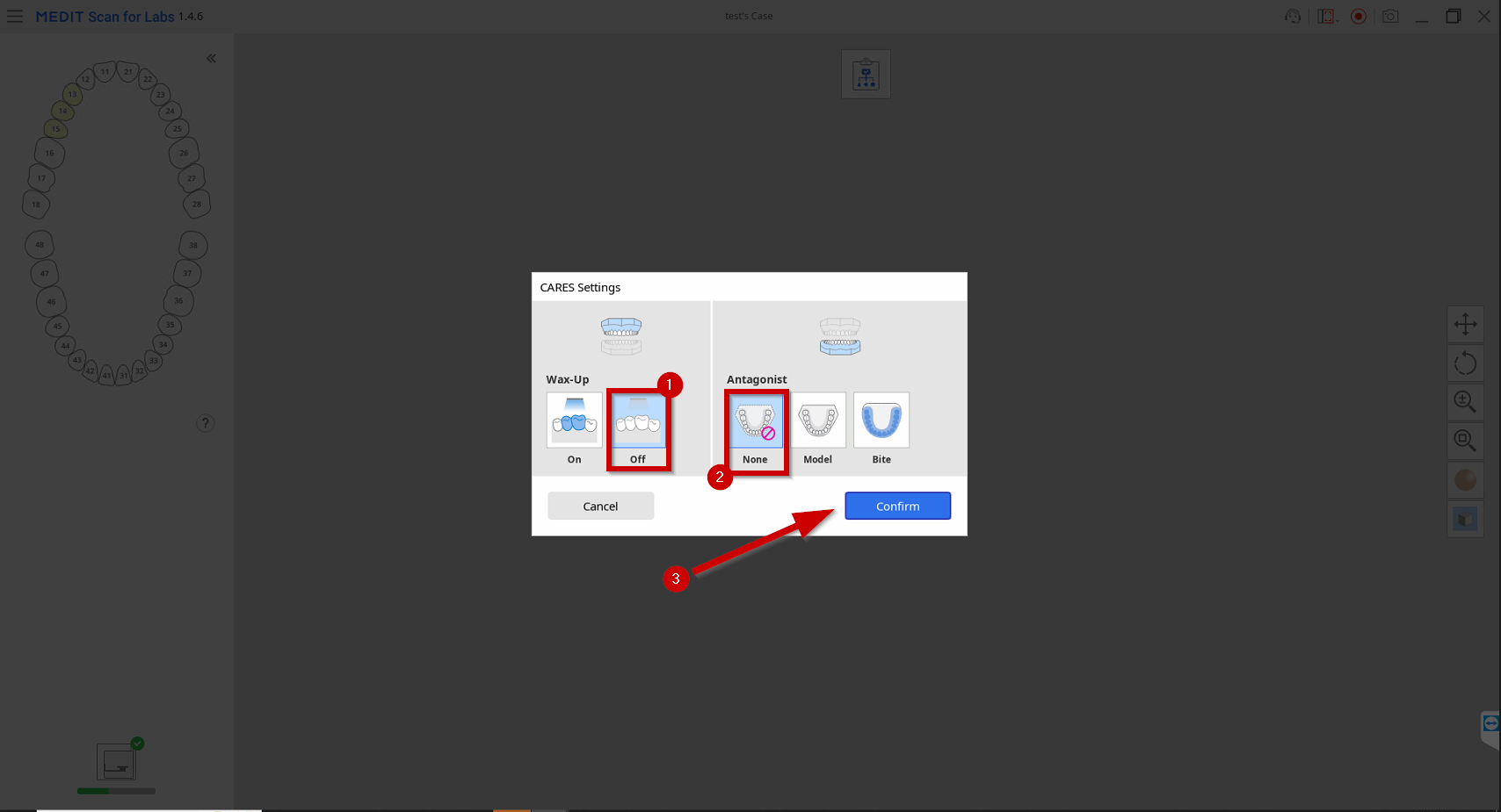 - The Medit link application will open to start the simple scan, the CARES Settings will open, select "Wax-Up: Off" and "Antagonist: None" and "Confirm":