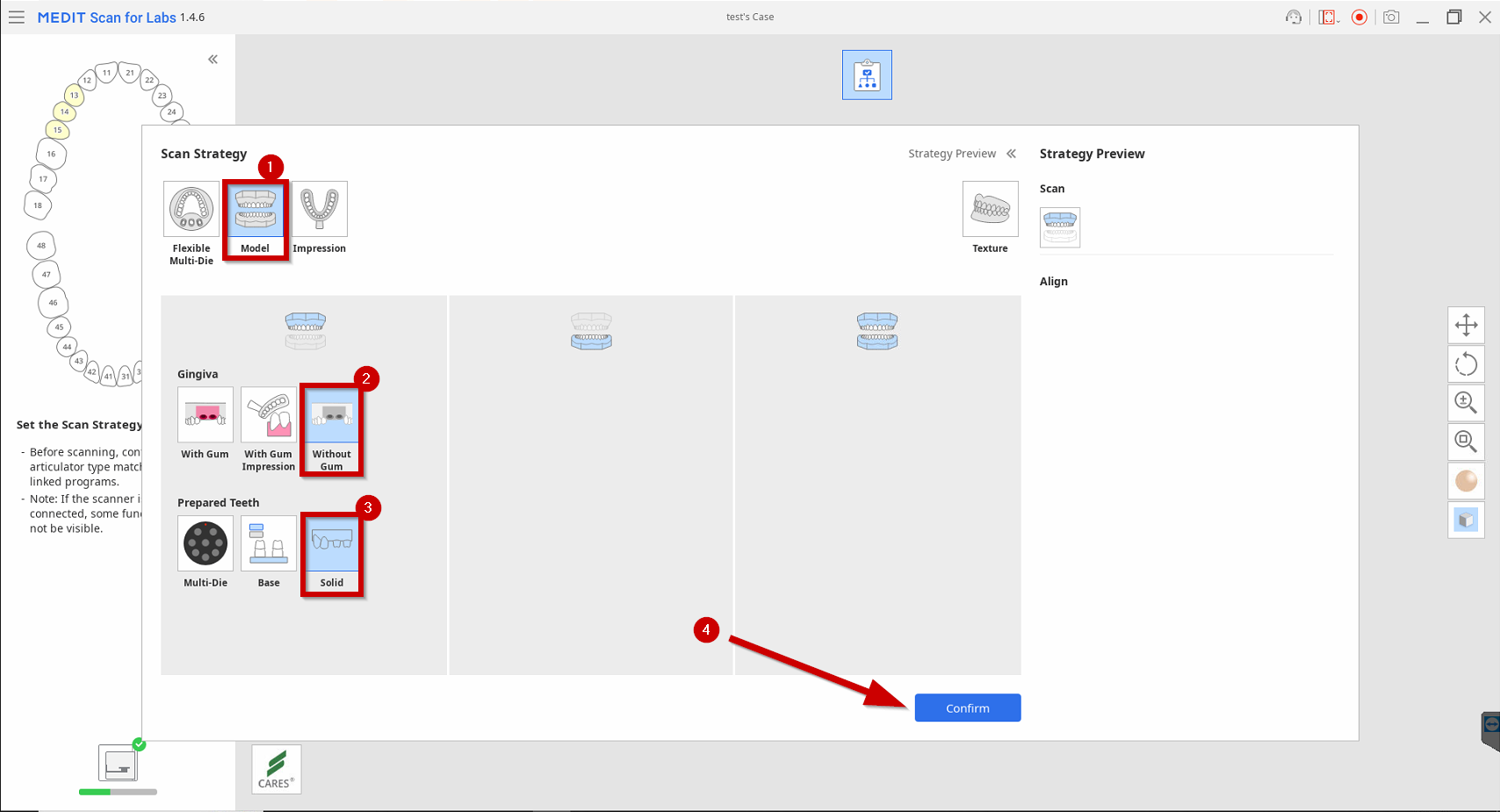 - Then the "Scan Strategy" will open select "Model", "Gingiva: Without Gum" and "Prepared Teeth: Solid" and "Confirmed":